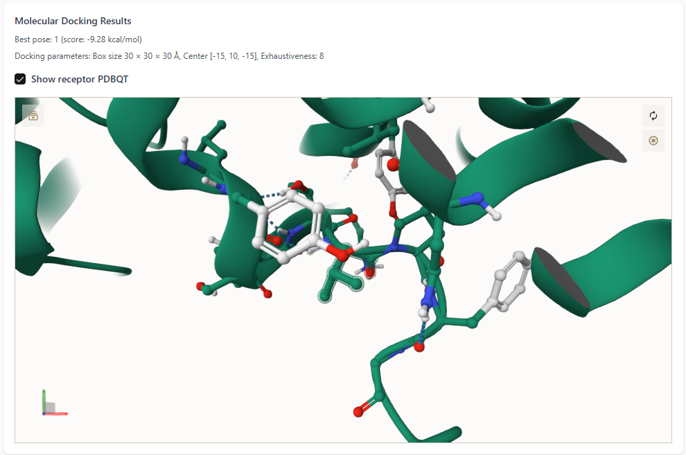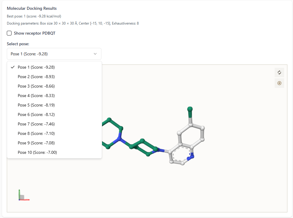 - Users can explore all docking poses by clicking the dropdown menu.
